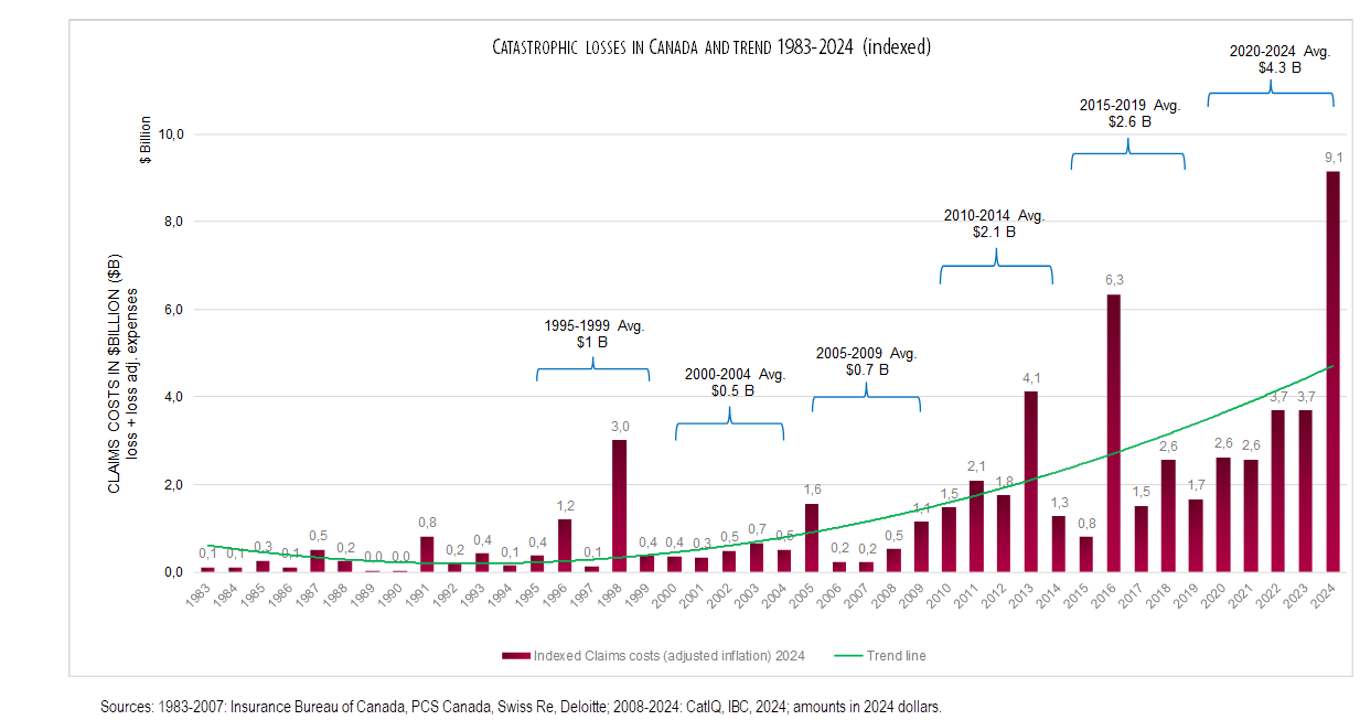 For more than 10 years, the costs of insured catastrophic losses in Canada continues to rise. In 2024, they broke a record and reached $9.1 billion and over the past five years, the average is $4.3 billion per year: