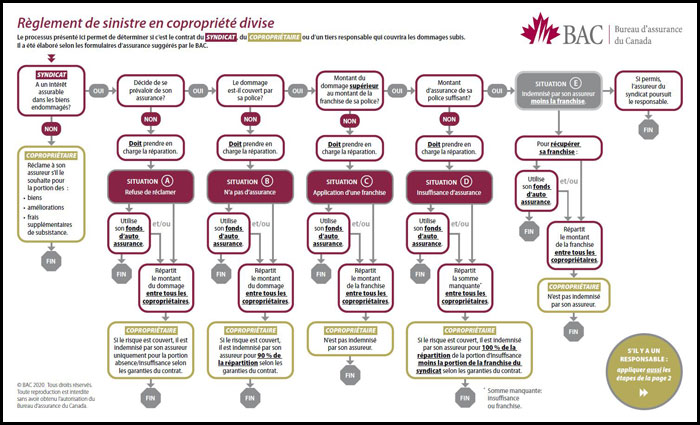 Le processus présenté ci-dessous (aussi disponible dans le microsite sur le règlement de sinistre en copropriété divise) permet de déterminer si c’est le contrat du syndicat, du copropriétaire ou d’un tiers responsable qui couvrira les dommages subis. Il a été élaboré selon les formulaires d’assurance suggérés par le BAC.